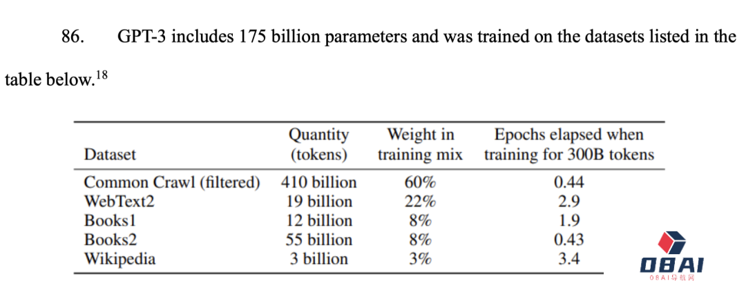 从下表中,可以看出有1750亿参数的GPT-3训练数据中,大部分的数据集都来自Common Crawl,所占权重高达60%。