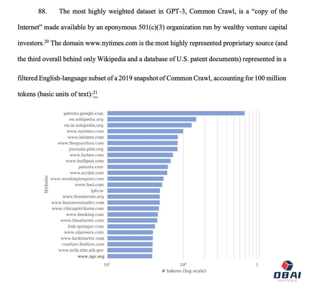 文件中,NYT提供了许多关键事实。比如,NYT是Common Crawl中用于训练GPT的最大的专有数据集。