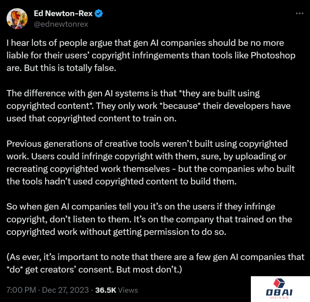 这位网友总结道,许多人认为,AI公司不应该像Photoshop这样的工具那样,对用户的版权侵权承担责任,这是完全错误的。