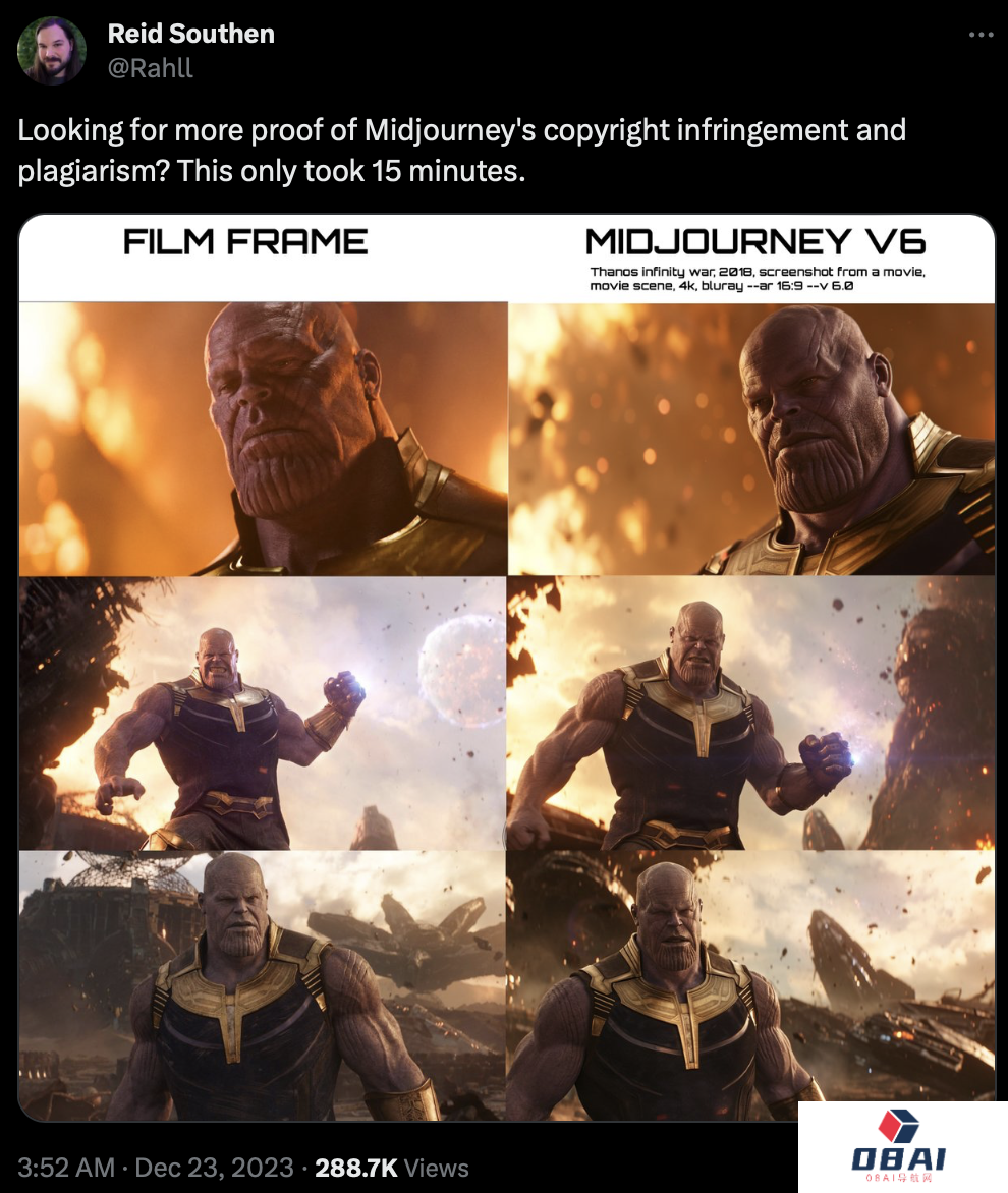 曾为漫威工作的插画家兼电影概念艺术家Reid Southen表示,只需要15分钟,就能找到Midjourney侵犯版权和剽窃的证据。