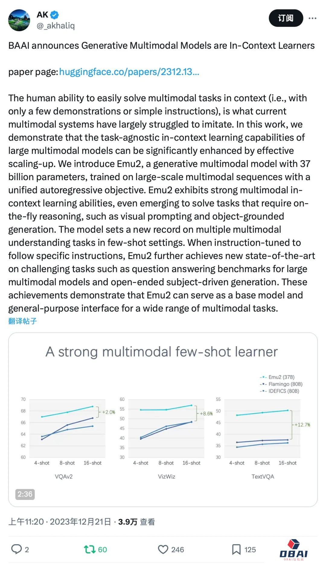 仅仅两周后,智源研究院便发布了最新一代生成式多模态开源模型——Emu2.
