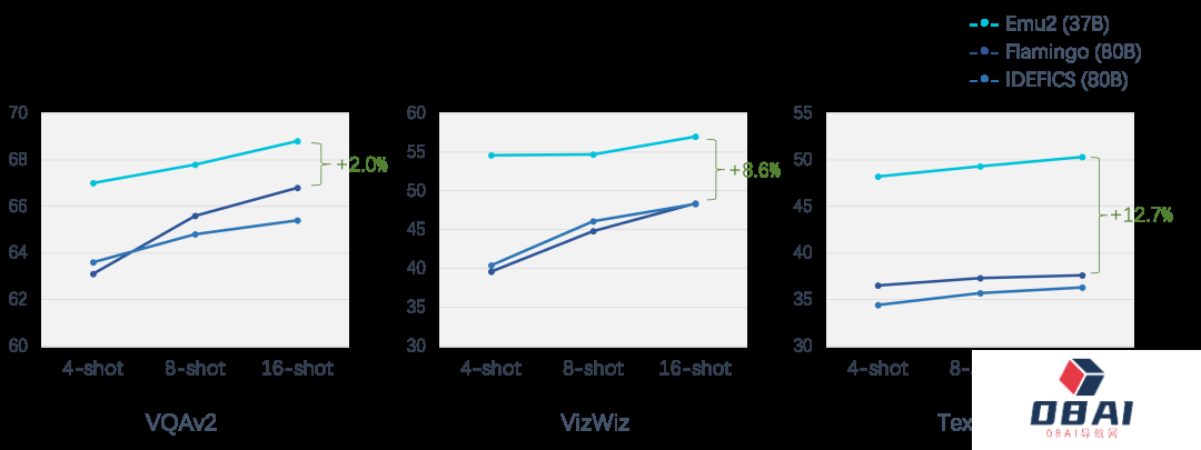 在少样本评测上,Emu2在各个场景下显著超过Flamingo-80B,例如在16-shot TextVQA上较Flamingo-80B 超过12.7个点。