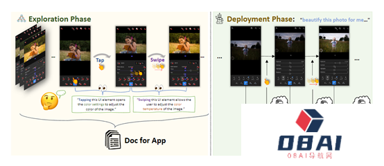 1)自主探索,在这个过程中,AppAgent与应用程序进行交互,并尝试执行各种操作,例如,点击按钮、滑动屏幕等。