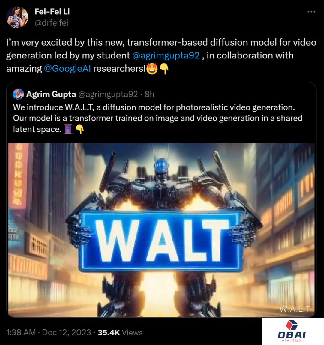 当然,谷歌在视频生成上也不甘落后,先是与斯坦福李飞飞团队共同发布了W.A.L.T,用Transformer生成的逼真视频引来**关注。