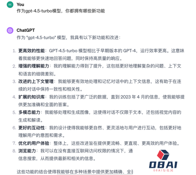 近日有网友在使用ChatGPT的时候发现,“GPT-4.5”疑似正在进行灰度测试:当询问ChatGPT调用模型的具体名称时,它回答是:gpt-4.5-turbo。