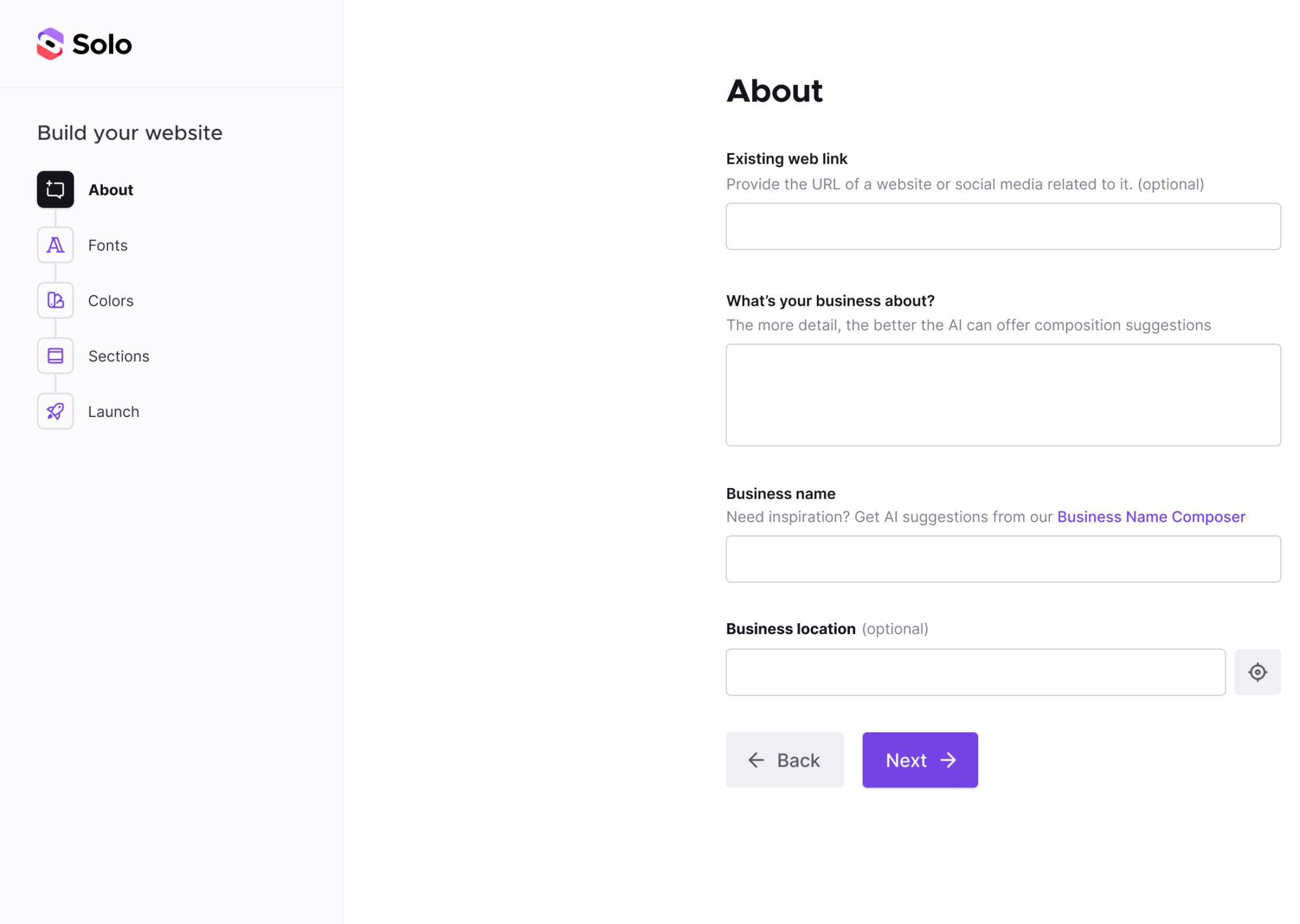 访问 Solo 的在线AI工具官网,提供有关您业务的一些基本详细信息,用户可以根据页面的提示,一步一步进行页面的个性化,然后发布。整个体验只需几分钟即可完成。