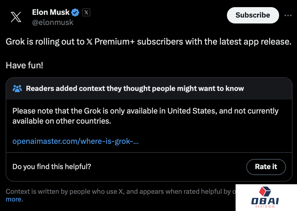 马斯克在自家的推特(X)平台发布贴文,声称 Grok AI 测试版暂时目前优先向美国地区的所有推特VIP(X Premium+)订阅者正式开放。