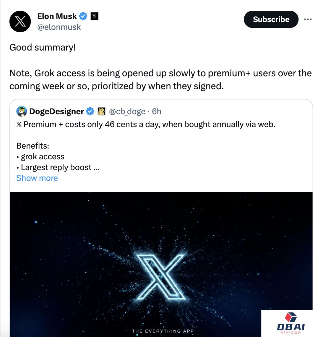 Grok 将直接包含在 X 的 Premium+ 订阅服务中,X 用户可以每月花费 16 美元 或每年 168 美元来进行订阅。