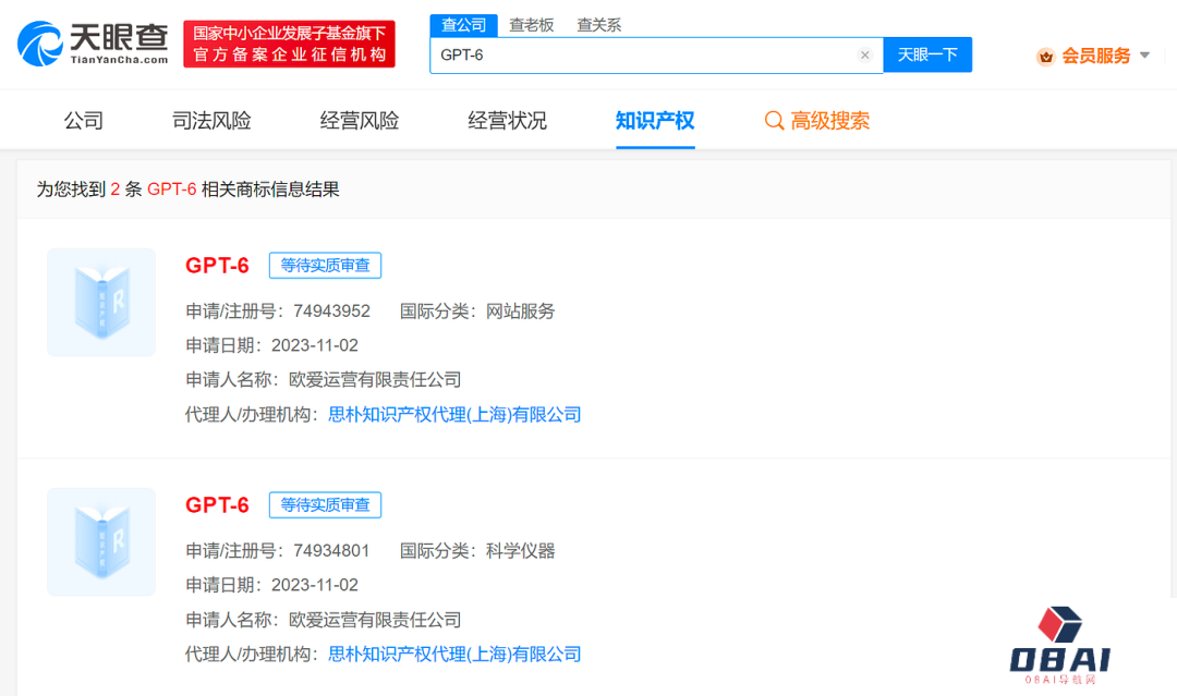 近日,OpenAI设在中国的产品运营公司”欧爱“正在申请多个GPT相关的商标,比如「GPT-6」「GPT-7」,国际分类为科学仪器、网站服务,当前商标状态均为等待实质审查。