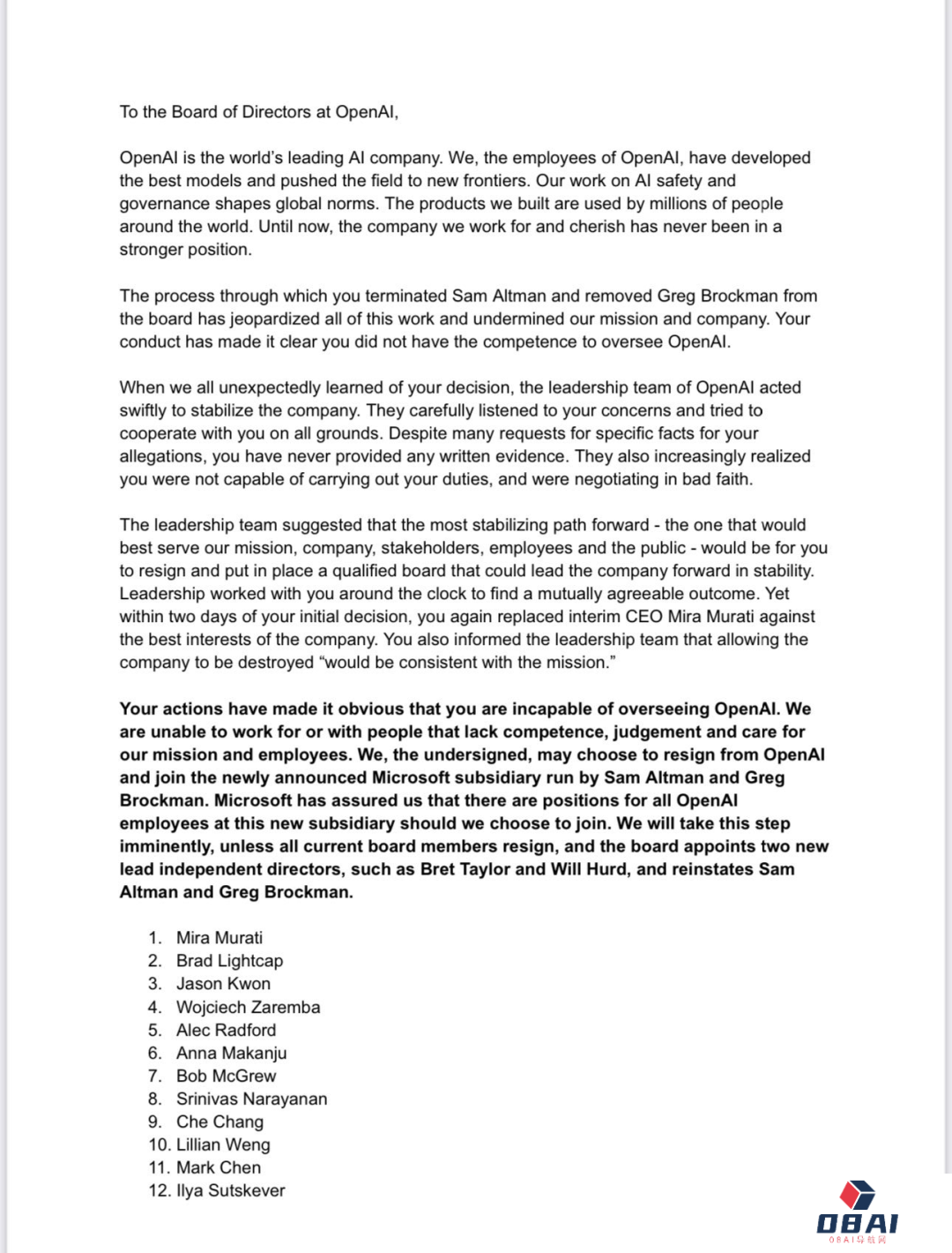Murati和员工们向董事会发出公开信:「我们无法为缺乏能力和判断力、不关心员工使命的人工作,无法再合作。」