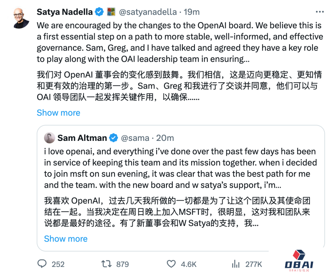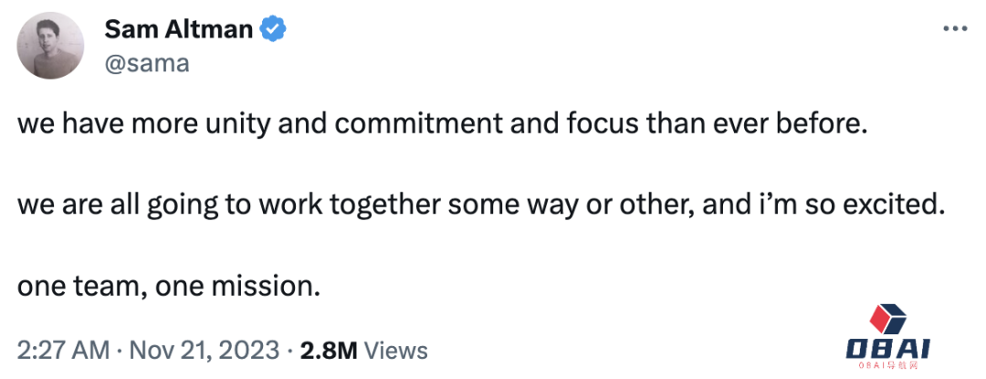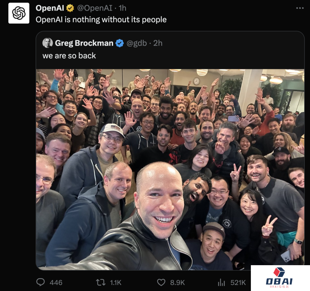 一位微软高管表示,Sam和Greg真的很聪明,他们本来可以去任何地方,但他们选择了微软。所有OpenAI人都选择了微软,就像他们在四年前选择我们一样。这是对我们所建立系统的巨大承诺。他们都知道,微软是继续自己工作的最佳地点,最安全的地点。」