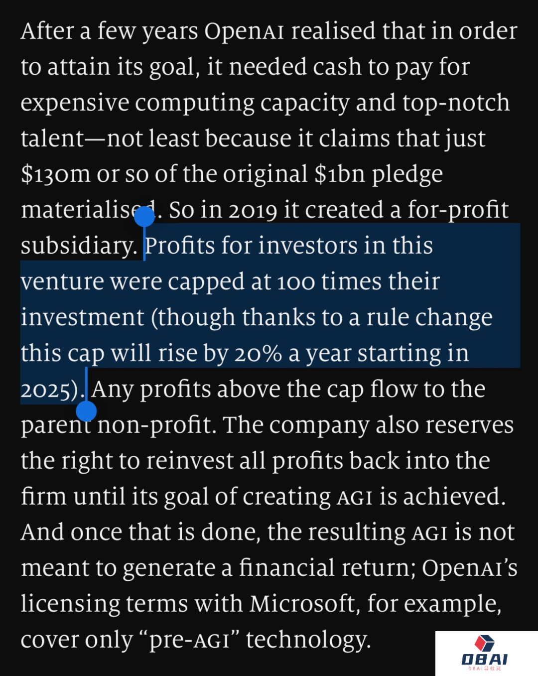 曾经,OpenAI的投资者回报率以100倍为上限,但他们改变了规则,因此从2025年开始,上限大约每4年翻一番,也就是说,利润上限会呈指数级上升。