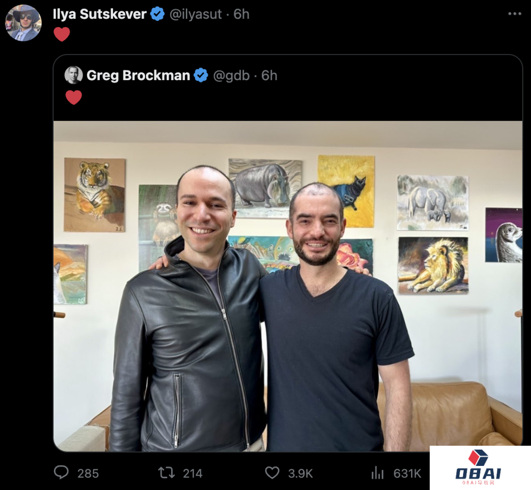 就在刚刚,Greg火速Po出了和Ilya的合影,po出一颗❤️,Ilya也转发了合影,同样以❤️回应。