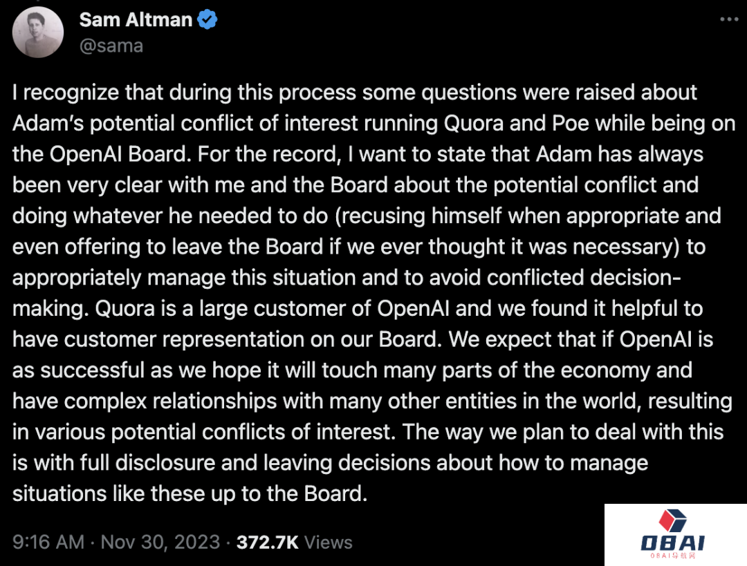 我发现,有人对Adam在OpenAI董事会任职期间经营Quora和Poe的潜在利益冲突有疑问。我想声明,Adam一直非常清楚我和董事会的潜在冲突,并且在竭尽所能对之斡旋,避免冲突(在适当的时候回避,甚至在必要时请辞)。