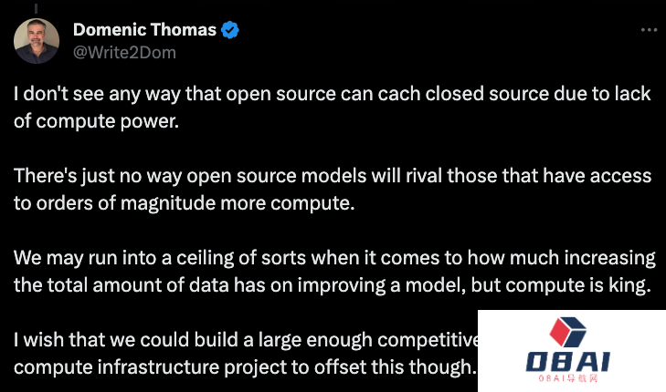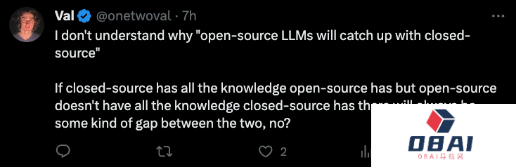 「不明白为什么开源和闭源的差距会缩小。毕竟开源模型的所有知识和技术是共享的,而闭源AI总有他们独有的东西。」