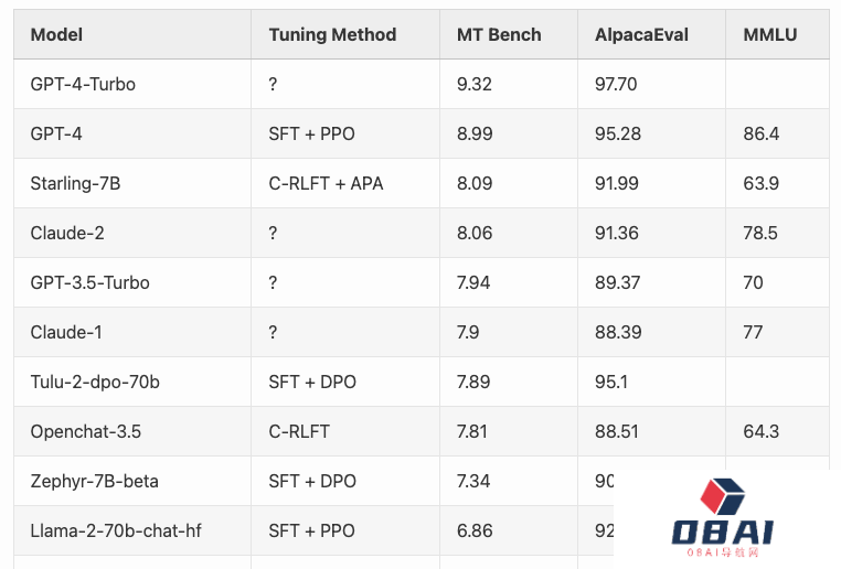 伯克利团队最近公布的Starling-7B,通过RLAIF的方式,在某些基准测试中超越其他的所有模型,接近GPT-4的水平。