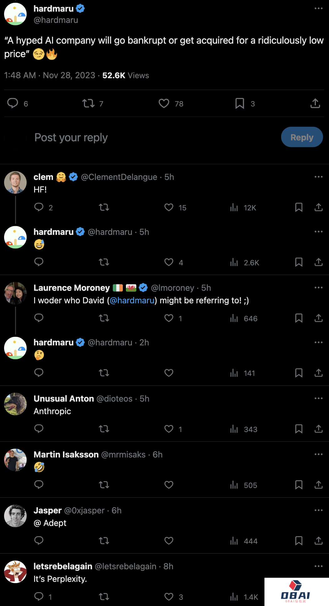 网友们也纷纷做出了各种猜测,Adept、Perplexity等明星初创公司都被网友提到。类似的事情在2023年已经出现:Jasper AI,这家曾经估值超过15亿美金的AI初创公司,作为「套壳GPT的鼻祖」,7月份就传出裁员+估值下降80%的负面新闻。