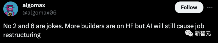 第二条和第六条都是笑话,虽然Hugging Face上会出现更多的开发者,但是AI依然会重构劳动力市场。