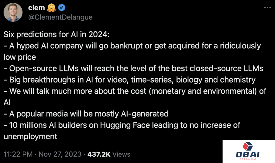 当地时间11月27日,全世界最大的AI开源社区Hugging Face CEO Clement Delangue对2024年行业的发展做了6条具体的预测: