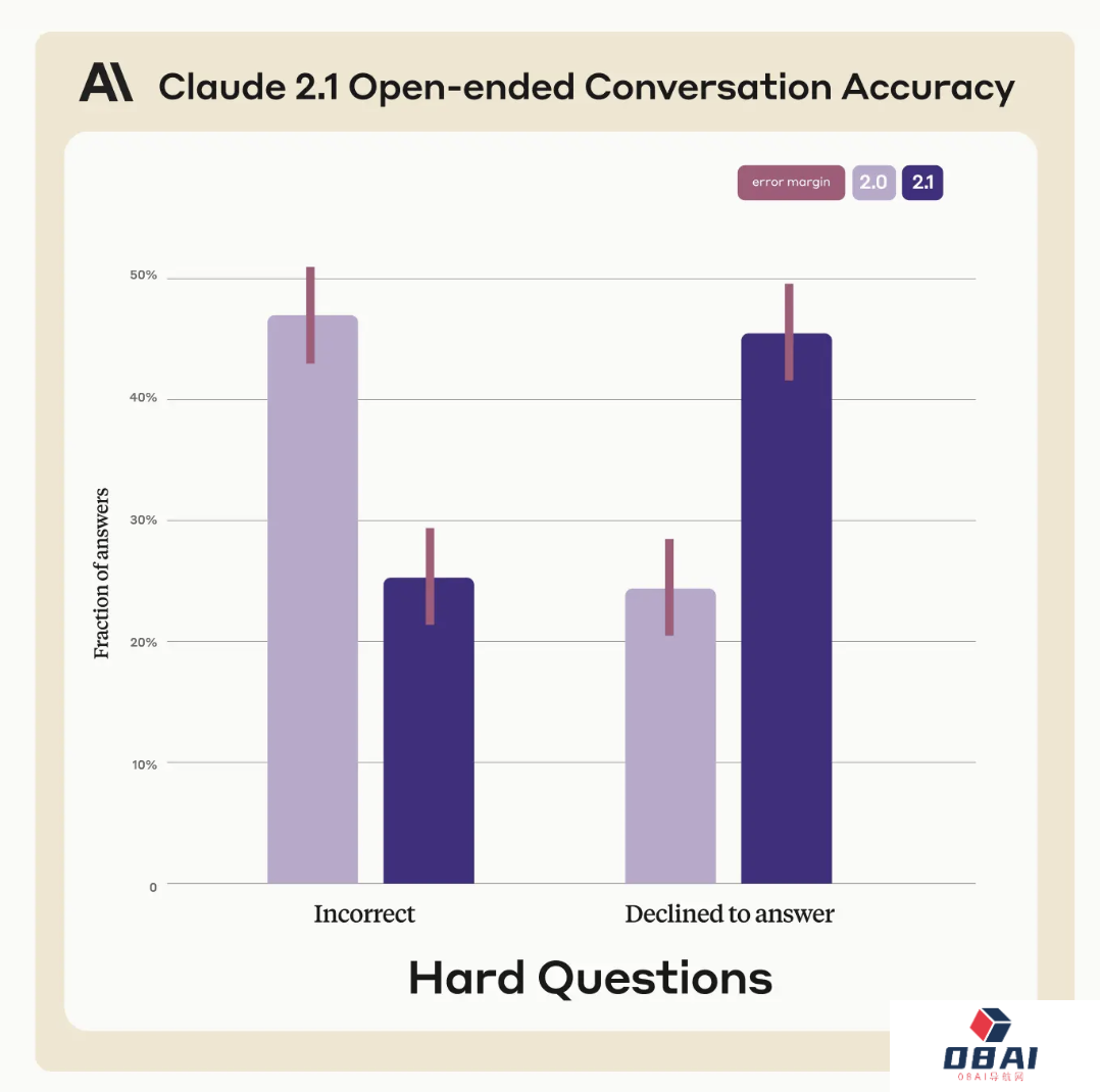 而在准确度上,Claude 2.1 号称准确率是 Claude 2.0 的两倍,改善了文本理解的能力,特别是对法律文件、财报与技术规格等精度和文法要求更高的文档进行了专属优化,宣称“出现错误答案的比例减少了 30%”。