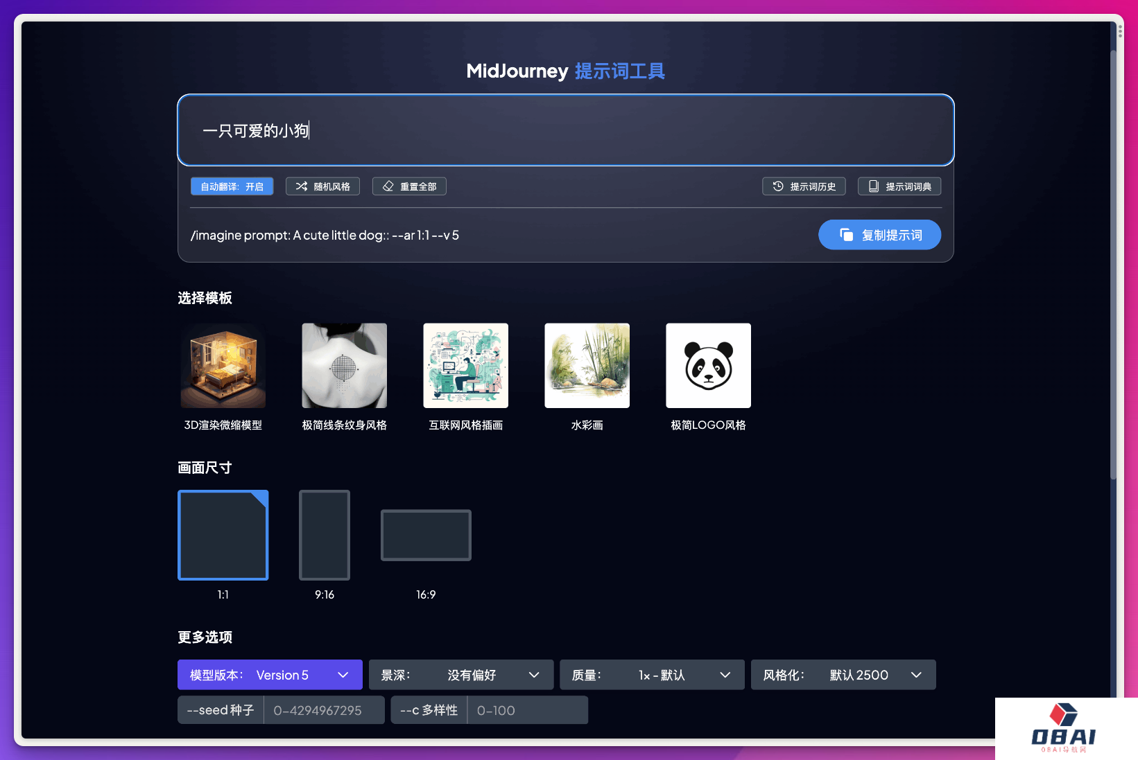 - 工具支持自动翻译,还可以根据用户的需求选择模板,如 3D 渲染微缩模型、极简线条纹身风格、互联网风格插画、水彩画和极简 LOGO 风格,并生成模板对应的提示词。- 用户还可以选择画面尺寸、模型版本、景深、质量和风格化等选项,快速产出一条高质量的提示词。