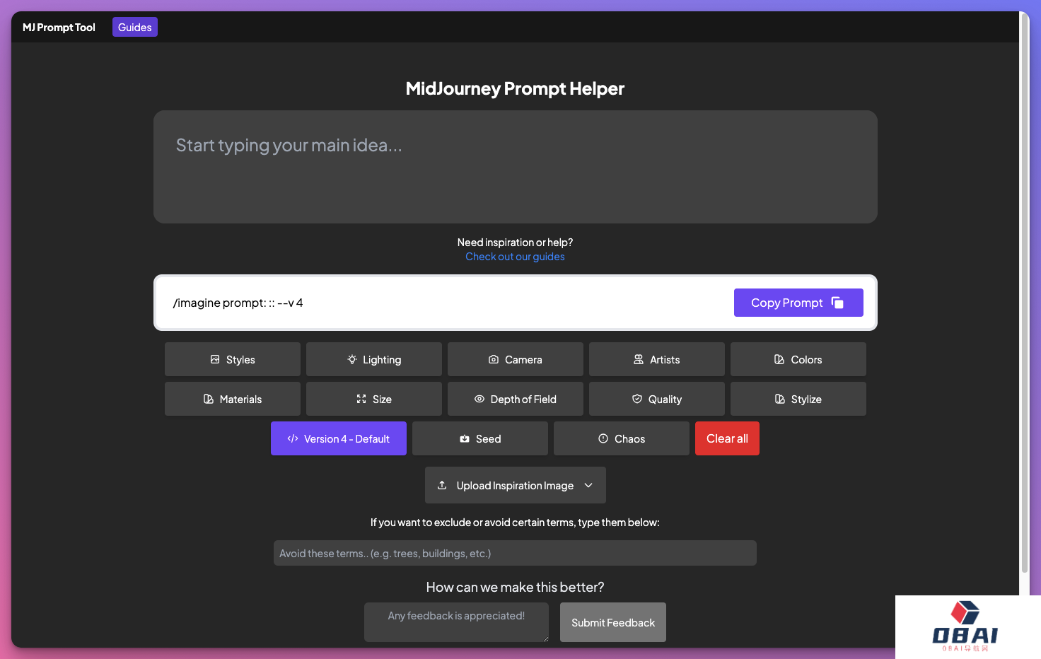 - 免费使用;- 输入想法,生成 MidJourney 提示词;- 支持多种设置,包括风格、灯光、相机、艺术家、色彩、尺寸等多种选项;