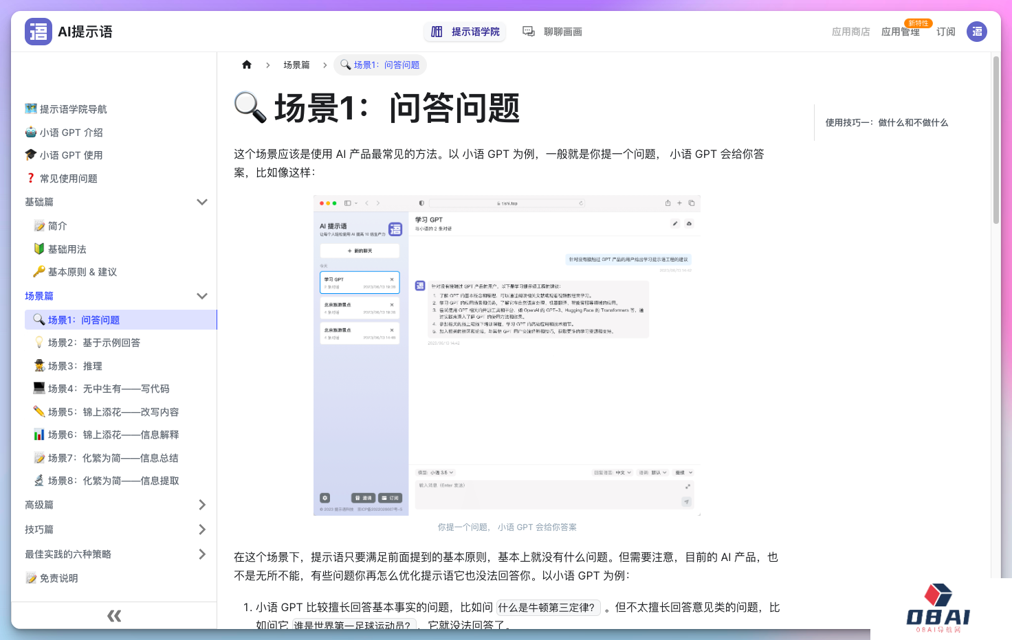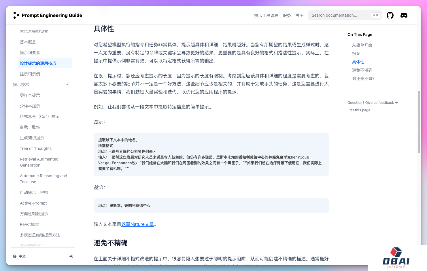 - 提示工程指南更偏技术向,提供了关于AI提示工程的专业介绍。如果不从事这一行业的话,建议仅查看其中的提示词技巧和示例。