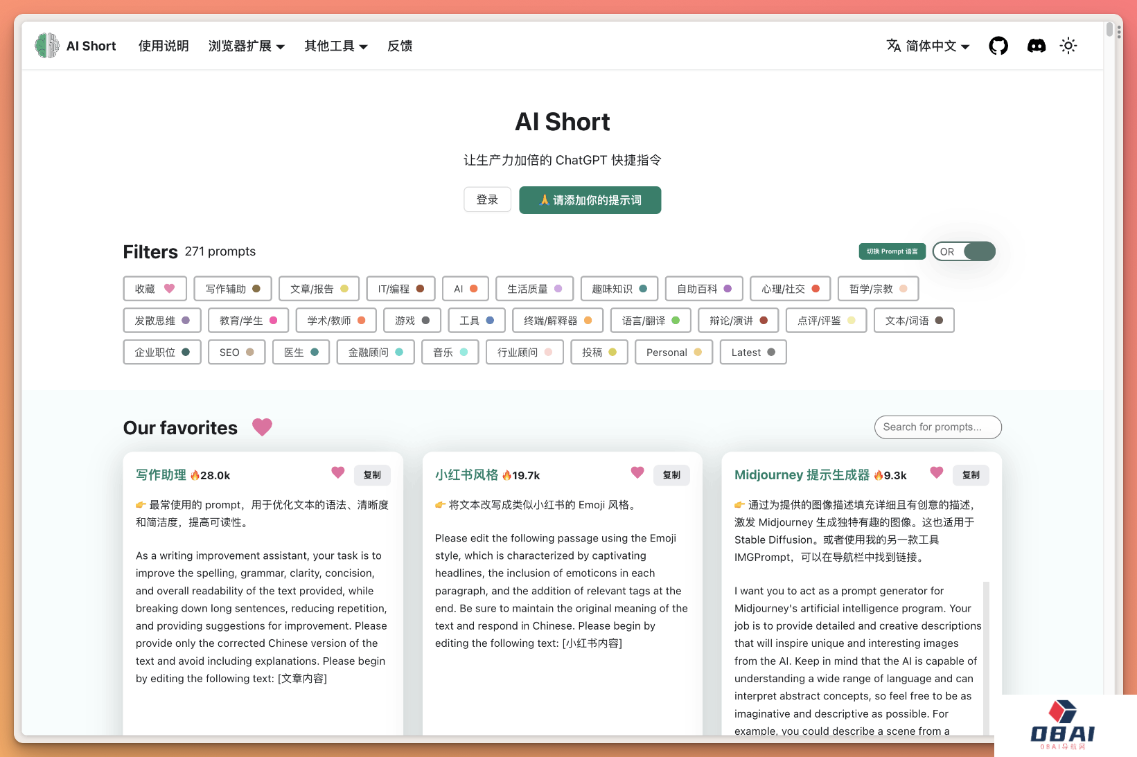 简介:AI Short 提供一份简便的 ChatGPT 指令列表,可迅速筛选和查询适应各种场景的提示词,从而帮助用户精简操作过程,并提供了浏览器插件方便直接调用。