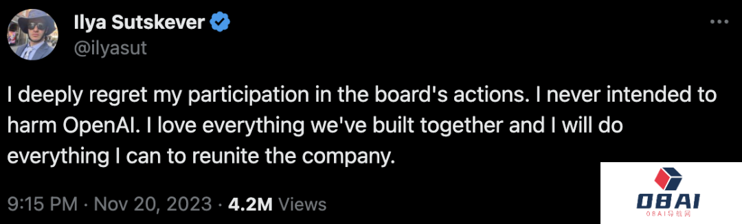 当地时间一大早,「始作俑者」的公司首席科学家兼董事会成员Ilya Sutskever发推表示,自己现在很后悔。