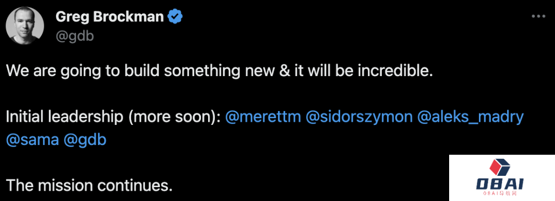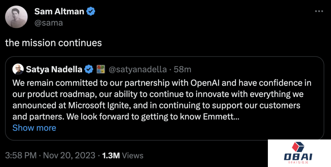 Altman和Brockman都回复了纳德拉的帖子「使命仍在继续」。