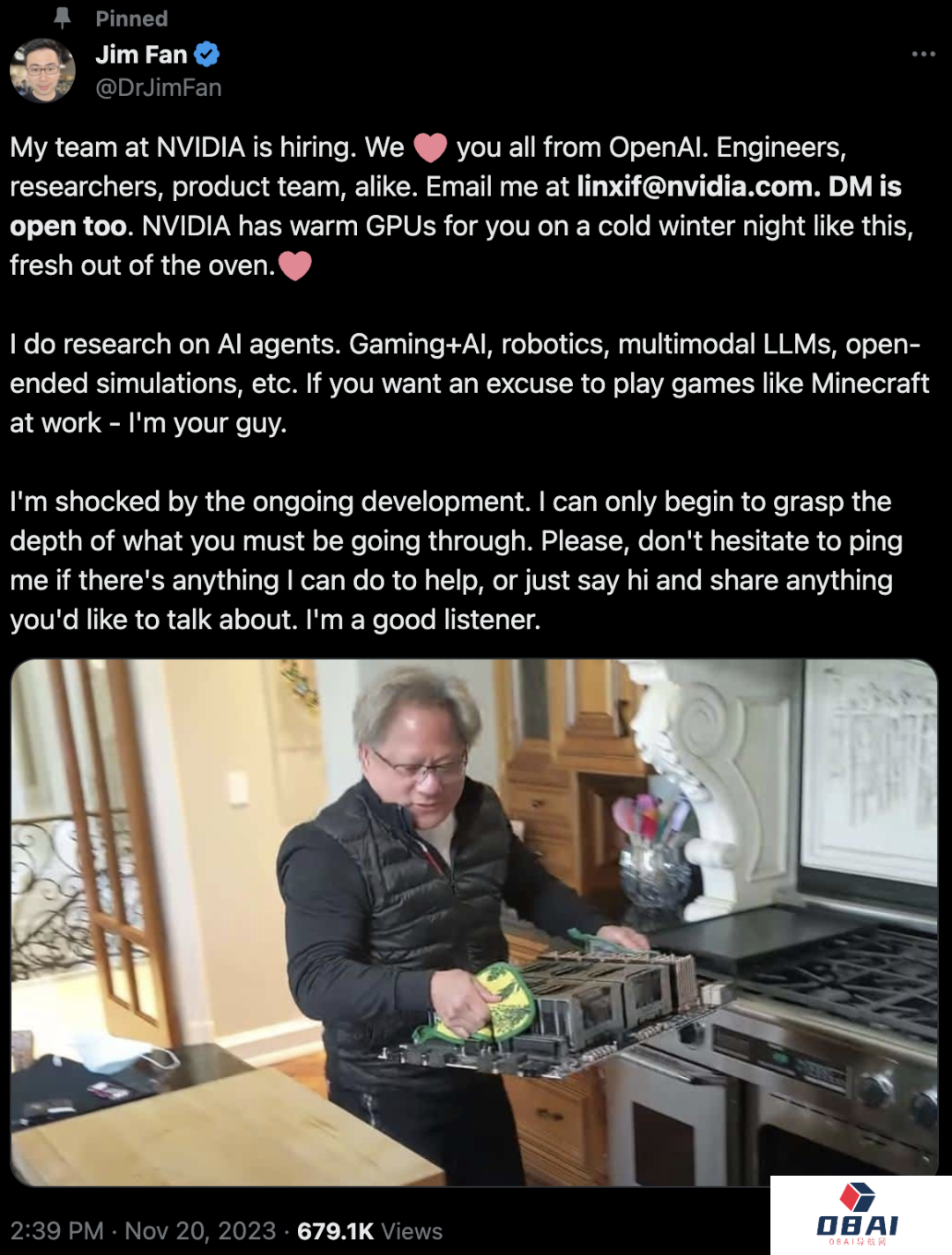 其他科技公司,更是抓住了这千载难逢的机会,全力招揽震荡中想要换一个环境的人才。比如,英伟达科学家Jim Fan马上发推招聘,摆出老黄热热腾腾刚出炉的H200,给那些「从OpenAI离开的员工一个新家」。