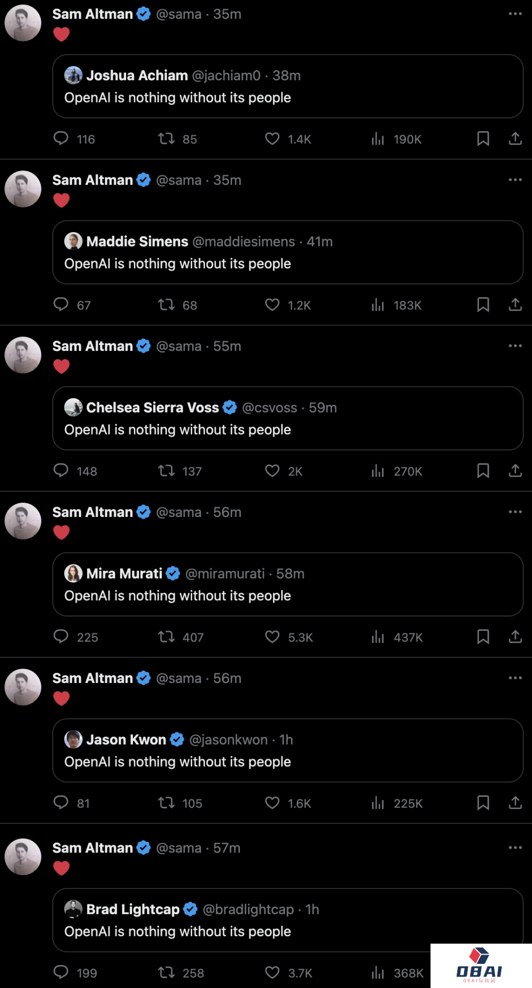 与此同时,员工们也纷纷来到推特上发帖高呼——「没有了员工的OpenAI啥也不是!」(OpenAI is nothing without its people)