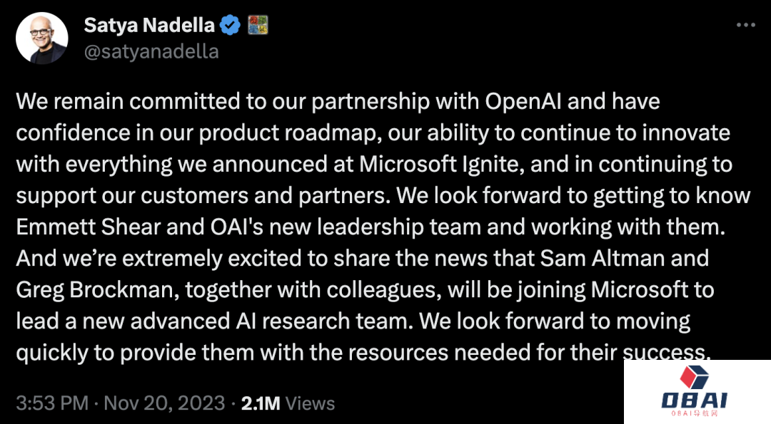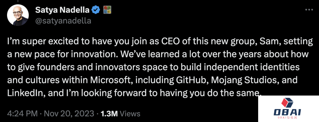 纳德拉紧跟着Altman的回复,明示了微软将会参照对待GitHub,Linkedin等组织一样,「给与创始人和创新者在微软内部足够的空间,去建立独立的身份和文化」。