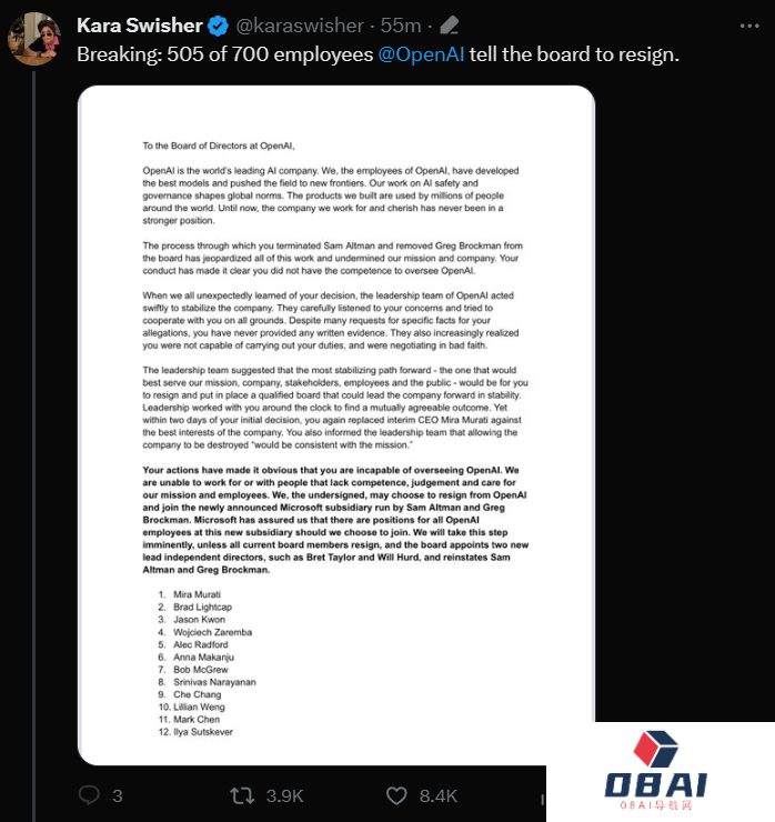 在联名信中,员工们甚至威胁说,自己很可能会跟随Altman去微软:「微软已经向我们承诺,如果我们愿意,新成立子公司的大门会向所有OpenAI员工敞开。」
