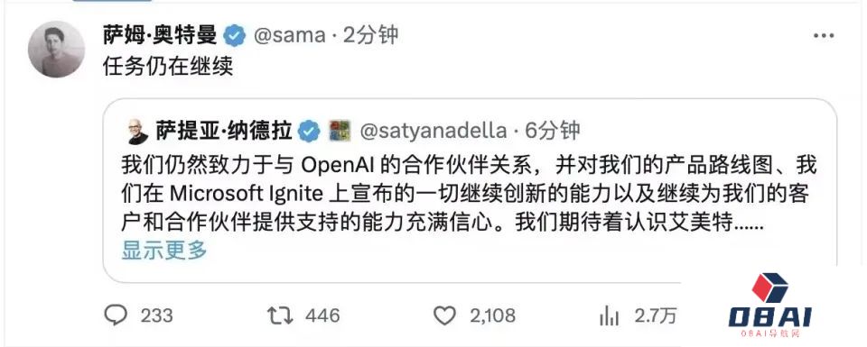 AI奇点网11月20日报道丨持续一个周末48小时紧张刺激的OpenAI“宫斗大剧”终于落下帷幕。11月20日下午消息,微软CEO纳德拉正式宣布,OpenAI创始人山姆·奥特曼与前任OpenAI董事会**Brockman,以及其他OpenAI的离职同事将加入微软。随后很快,奥特曼也转发了这条推文,附文“任务仍在继续”,以此确认该消息。