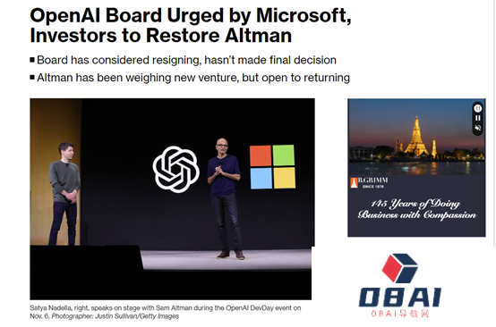 据彭博最新消息,OpenAI的大股东微软以及兴盛资本、老虎全球管理基金等主要投资者,希望奥特曼可以重回OpenAI。