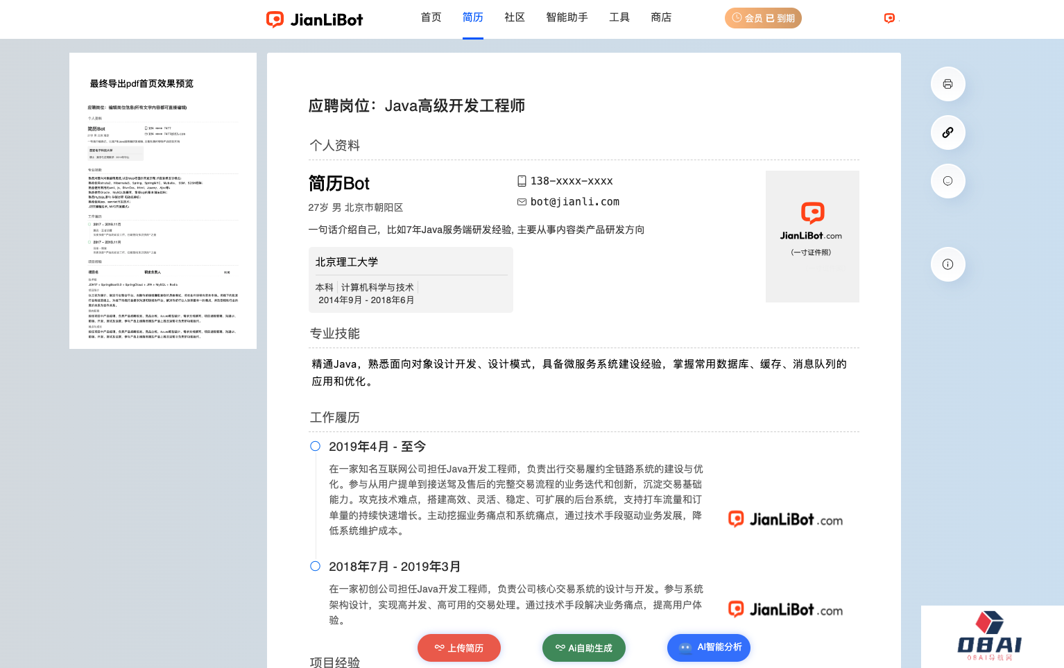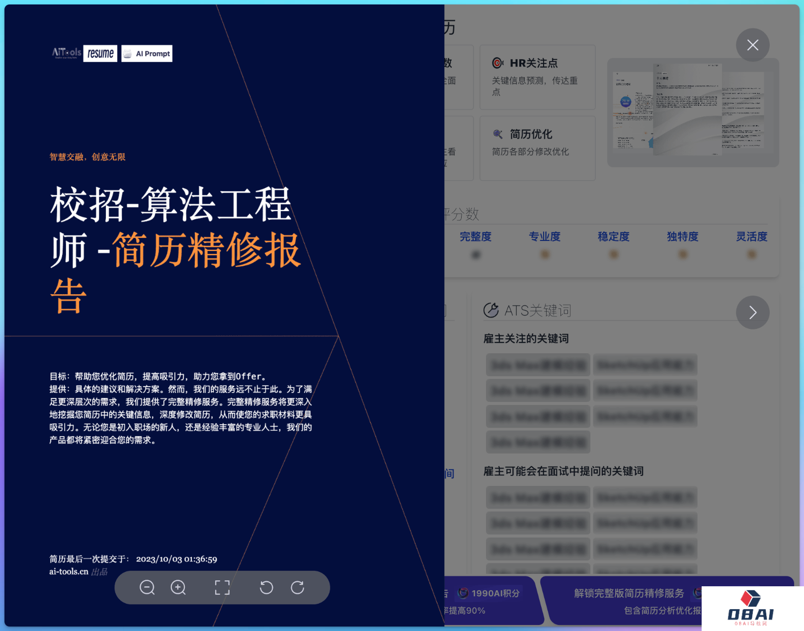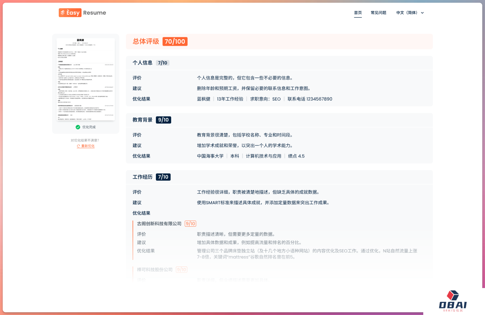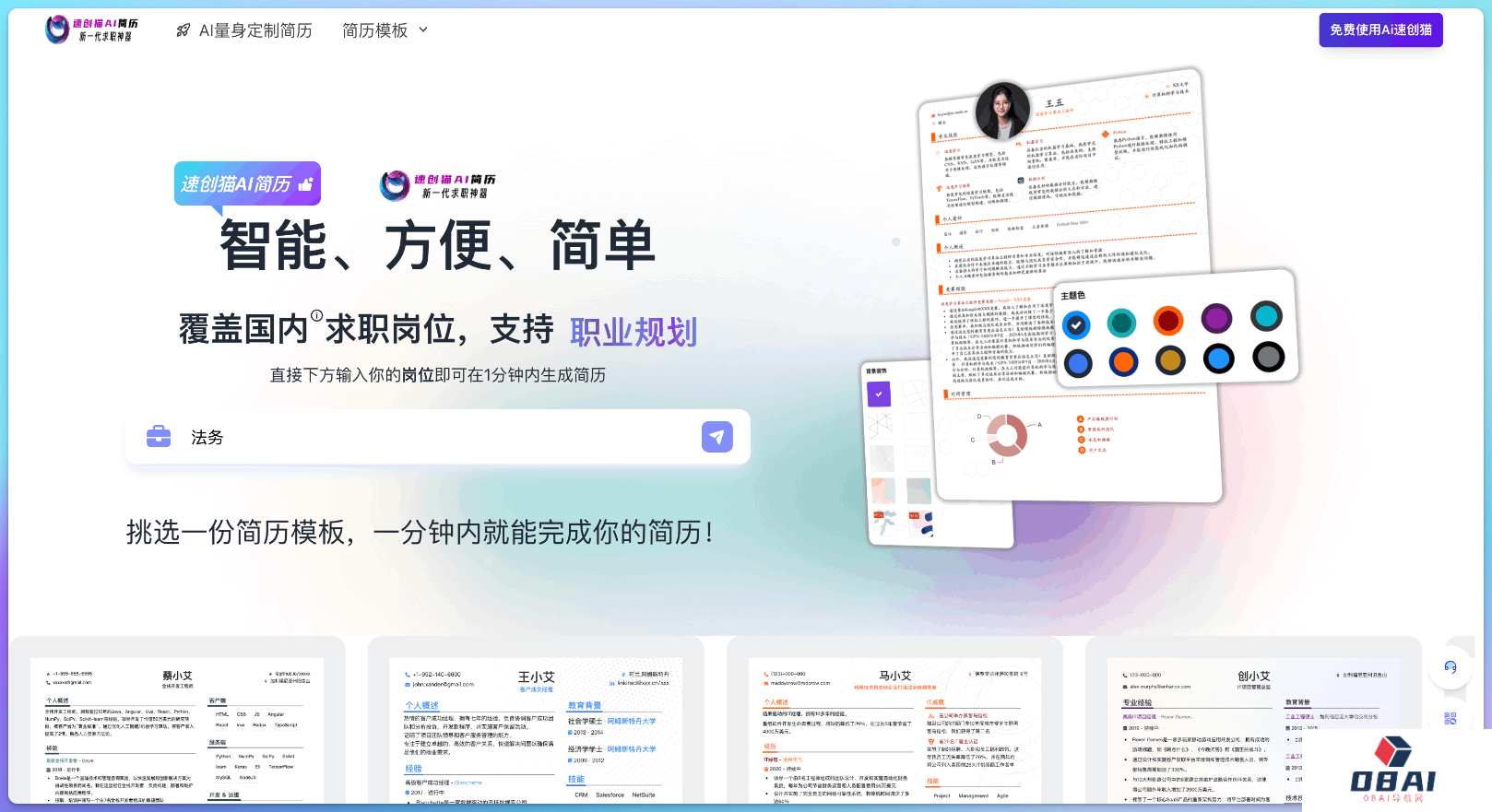 简介:一个支持多语言、多功能的专业AI简历生成器,根据优化提示,快速创建标准化、专业的简历,帮助用户改进简历,吸引人力资源部门面试官。