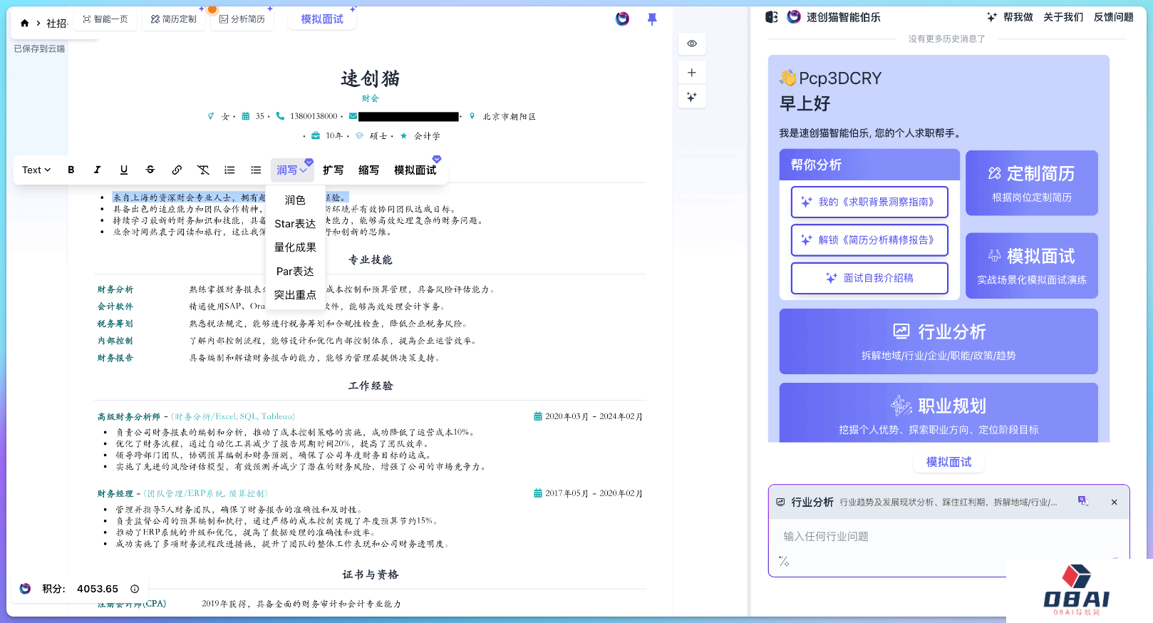 提供智能优化简历内容、全面的职业规划、行业分析、模拟面试、求职辅导,提高通过率;
