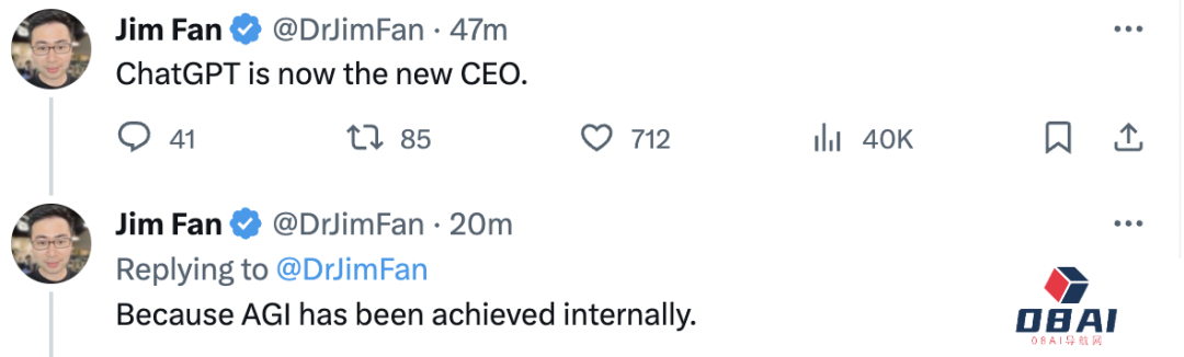 英伟达科学家Jim Fan发文打趣称:OpenAI已经率先实现了AGI,ChatGPT现在是新任CEO了。