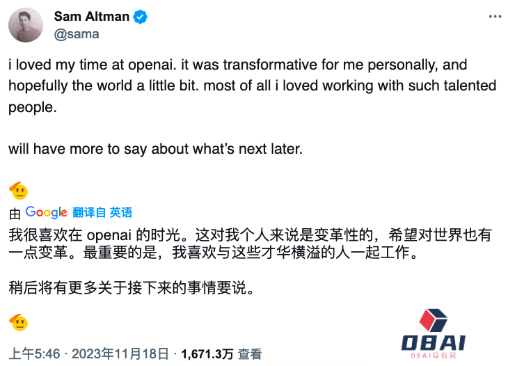 “非常喜欢在OpenAI工作的时光,关于下一步的打算,稍后会有更多信息公布。”