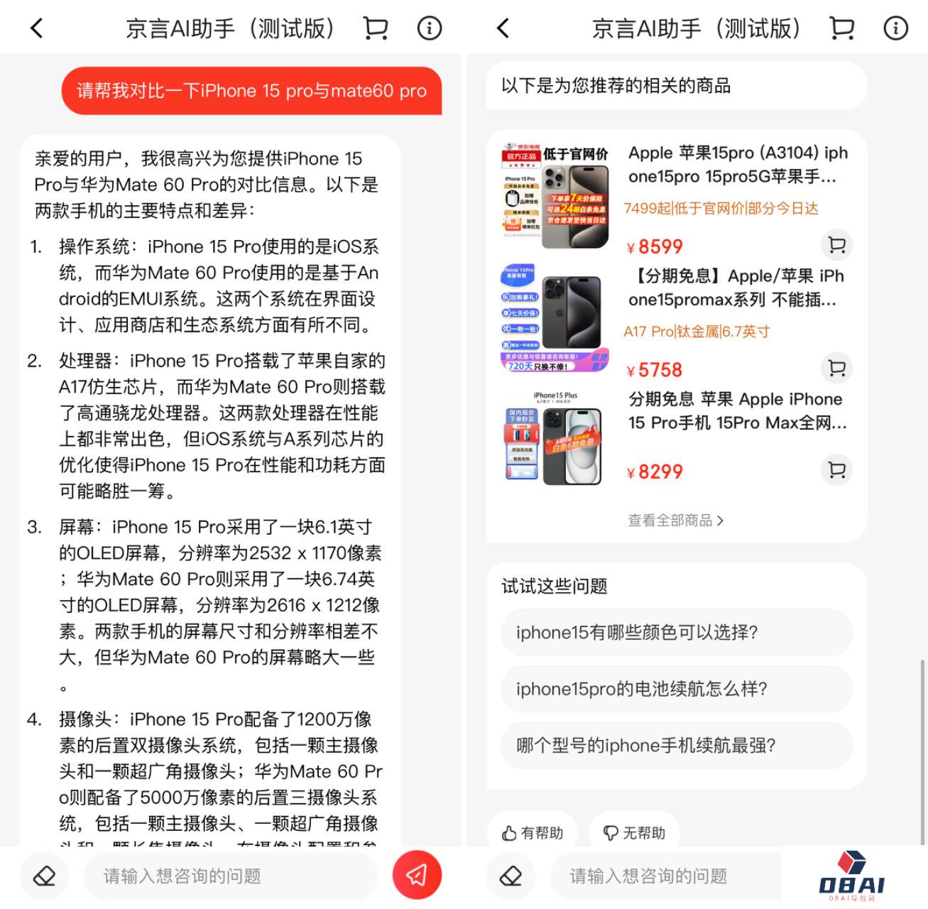 但是我们也发现,京言 AI 导购助手也会出现一些事实性错误,比如“华为Mate 60 Pro搭载基于Android的EMUI操作系统”。此外,iPhone 15 Pro的屏幕尺寸也是错误的,诸如此类等等。我们认为,京言 AI 导购助手尚不足以达到实际商用的要求。