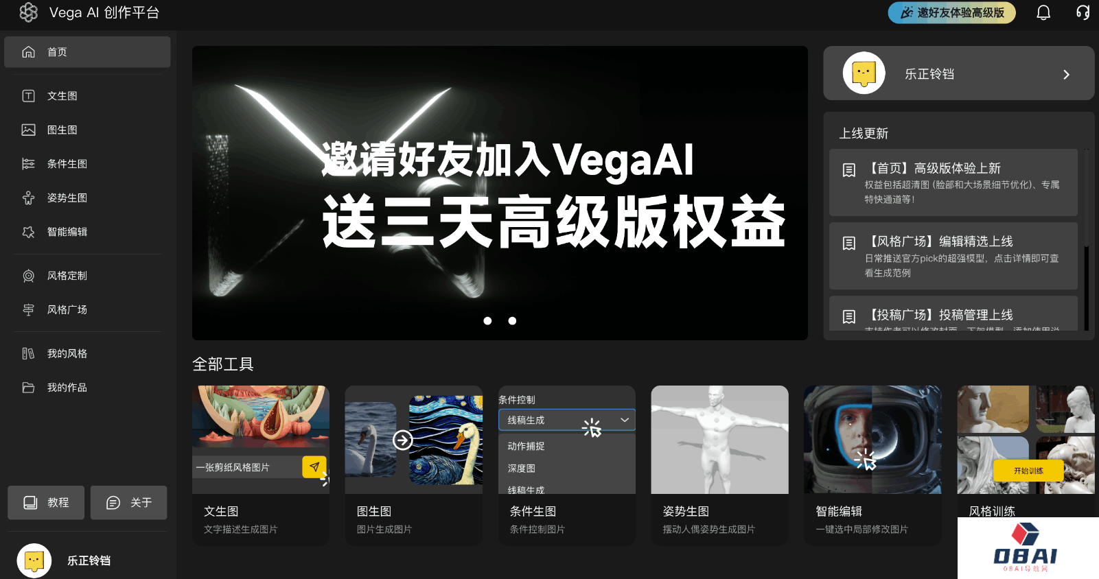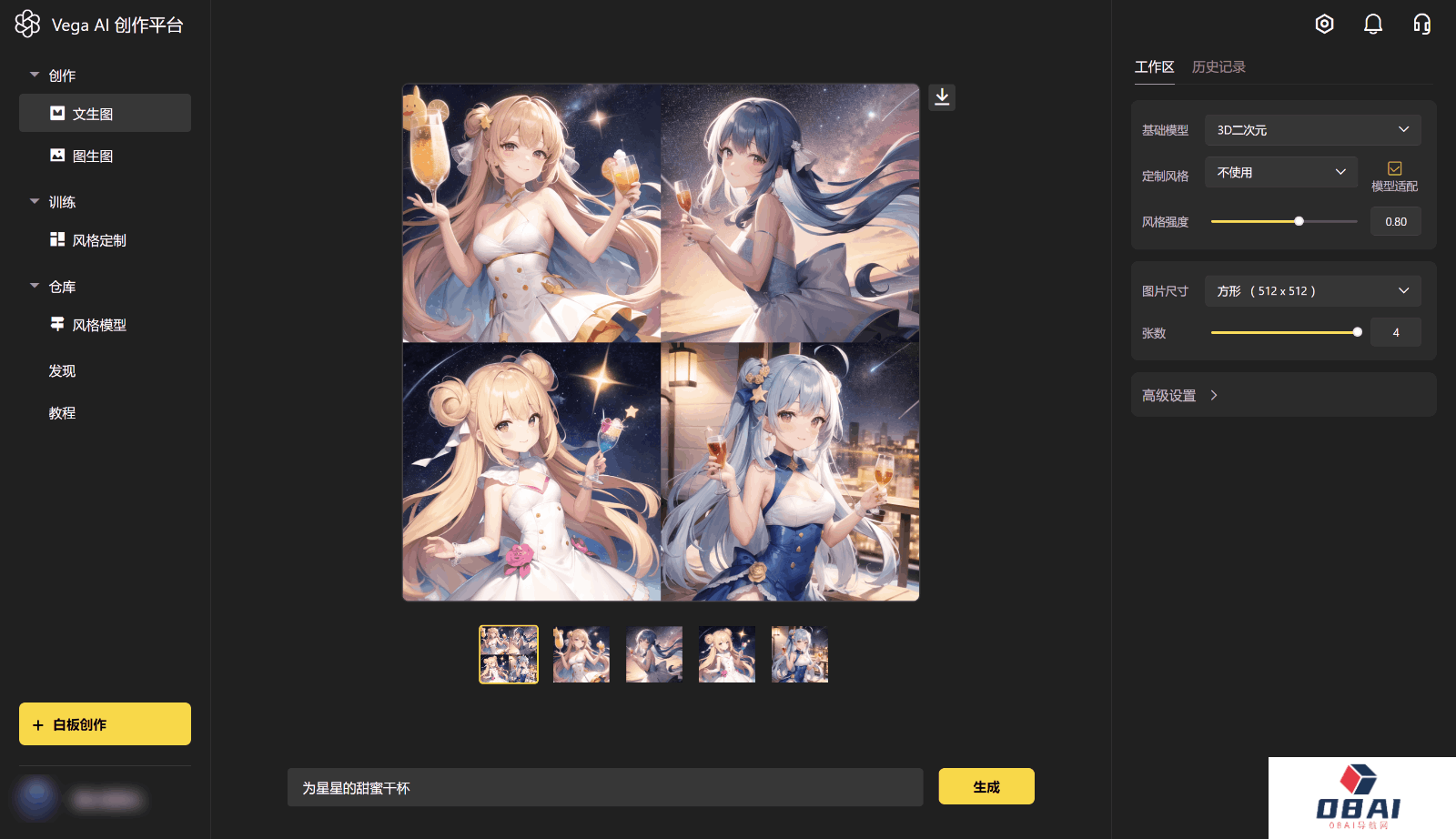 Vega AI是国产AI绘画作图平台,不仅可以支持文本生成图、图片生成图片,还支持图片风格转换等等功能,应该是基于Stable Diffusion模型的基础上打包上传了一些lora小模型,同时也支持用户自己上传图片训练模型。
