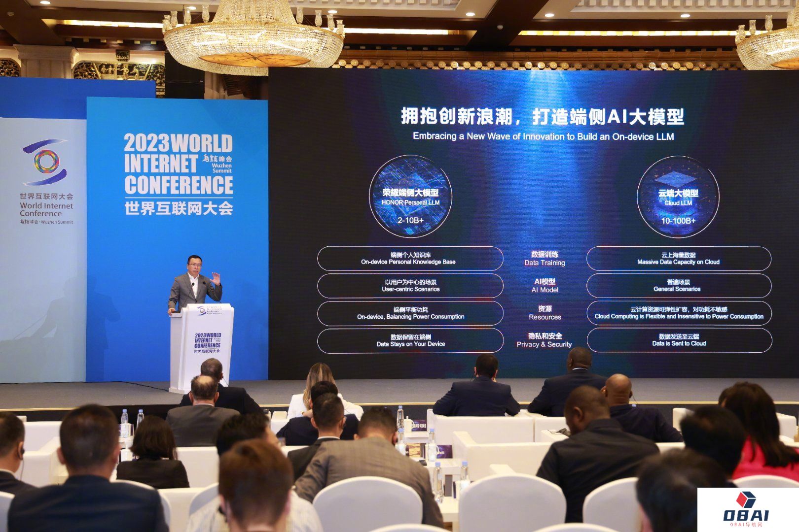 在日前举行的2023世界互联网大会乌镇峰会上,赵明出席大会并作演讲,现场晒出了一张PPT显示,荣耀端侧 AI 大模型已经可以实现20亿~100亿参数量的加载,而云端AI大模型可以实现100亿~千亿级参数量。