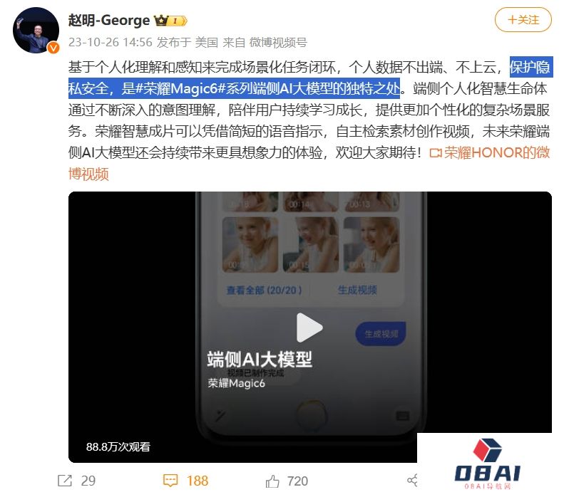 高通的发布会结束不久,荣耀官方就对外放出了一段基于荣耀手机端侧大模型的产品预热视频,展示了端侧个人化智慧生命体通过不断深入的意图理解,陪伴用户持续学习成长,提供更加个性化的复杂场景服务。赵明还强调,保护用户隐私是荣耀的端侧AI大模型的独特之处。