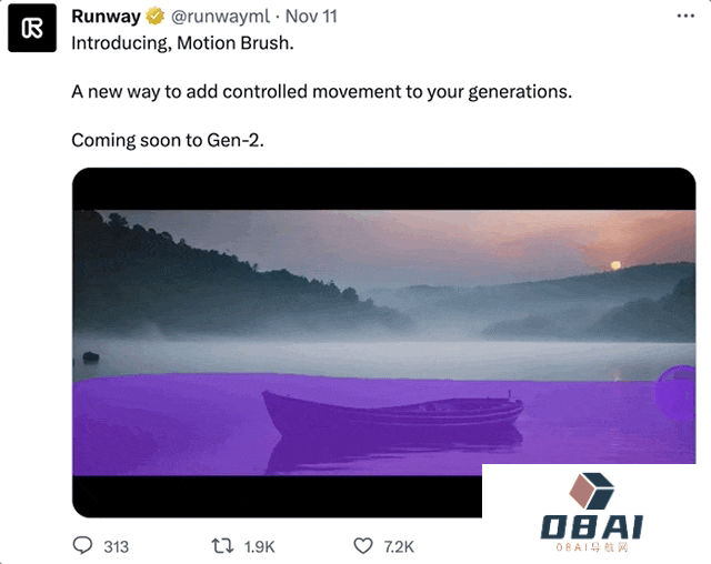 这个Runway新推出的功能叫做运动笔刷(Motion Brush)。