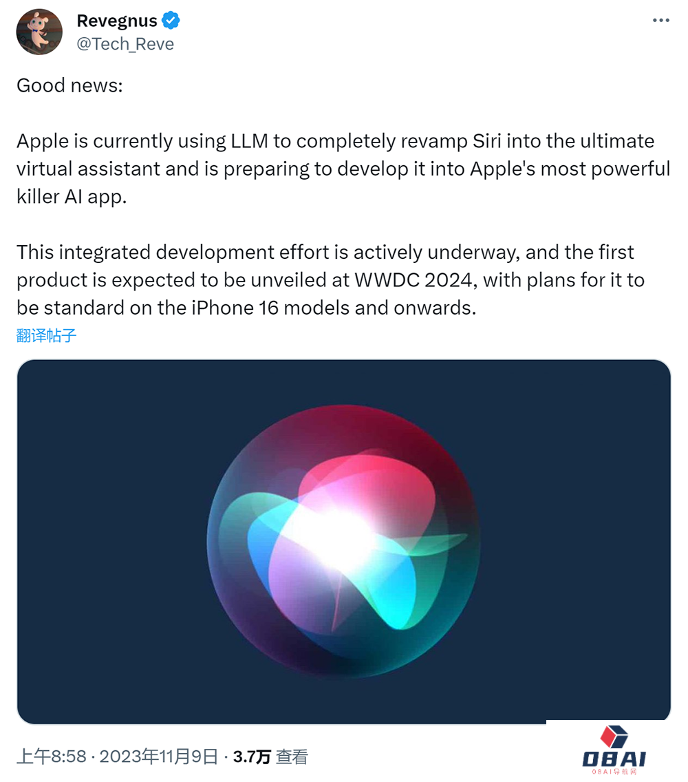 来自推特(X)社交平台的@Tech_Reve的最新爆料,苹果公司正在使用大语言模型将Siri完全改造成“超级AI虚拟助手”,并准备将其开发为“最强大的杀手级AI应用”。这项集成开发工作正在积极进行中,预计全新嵌入操作系统的Siri将会在WWDC 2024上亮相,并成为下一代手机iPhone 16及后续机型的标配。