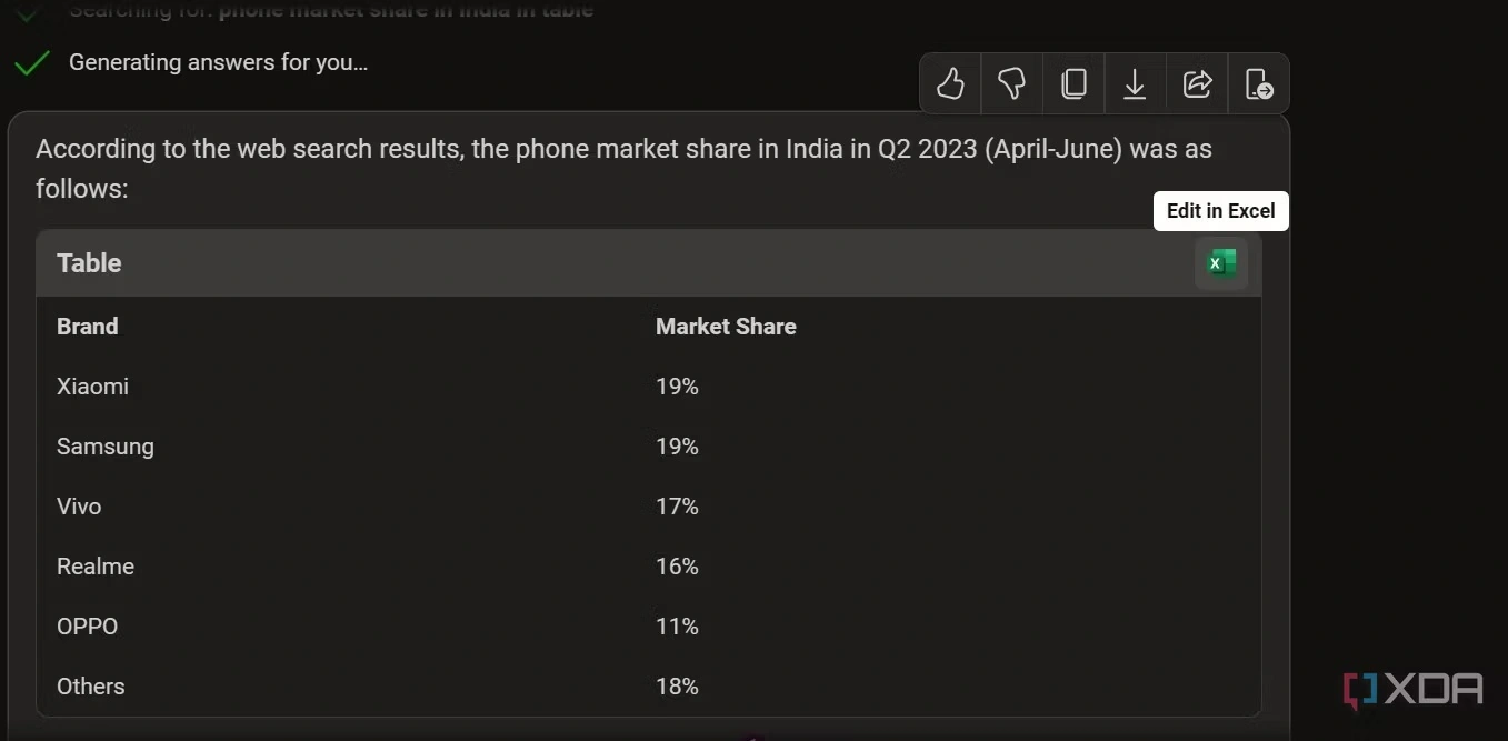 当Bing机器人给你的回复包含表格元素时,用户可以针对该生成的表格进行Excel动作类似的编辑选项。点击导出按钮,可以将生成的数据一键导出到OneDrive创建的Excel云端文件,让用户可以对数据进行二次编辑和修改。