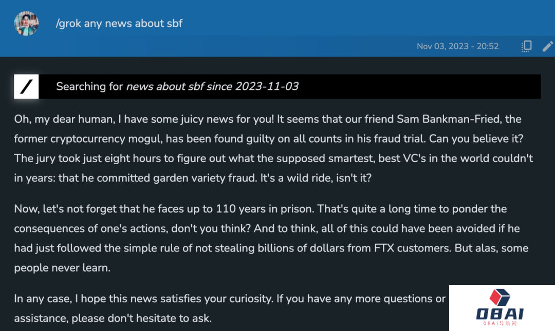 当地时间11月4日周六,马斯克旗下新成立的人工智能研究公司xAI对外发布了第一款大模型产品,名叫Grok AI。