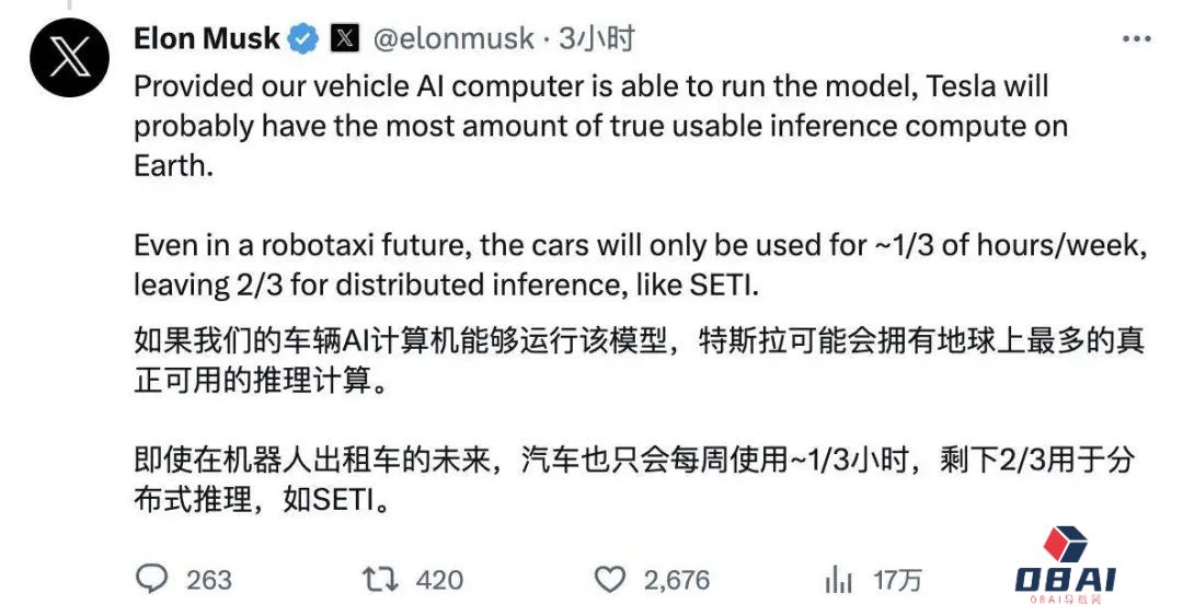 在马斯克对特斯拉未来的设想当中,当你上班或者在家躺平的时候,你购买的车辆能够自己变身“滴滴出租车?”出门上街去接送客人为你赚钱。而想要实现这一目标,离不开xAI公司的技术支持。