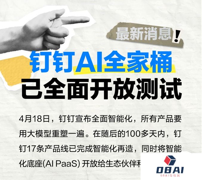据钉钉官方发文称,钉钉AI全家桶已全面开放测试。据悉,邀测期间超50万企业组织已启用钉钉AI,使用频率最高的行业为制造业、互联网、零售行业,钉钉AI能力目前已扩展到钉钉聊天、文档、知识库、脑图、闪记、Teambition等17条产品线,覆盖60+场景和近100项AI技能。
